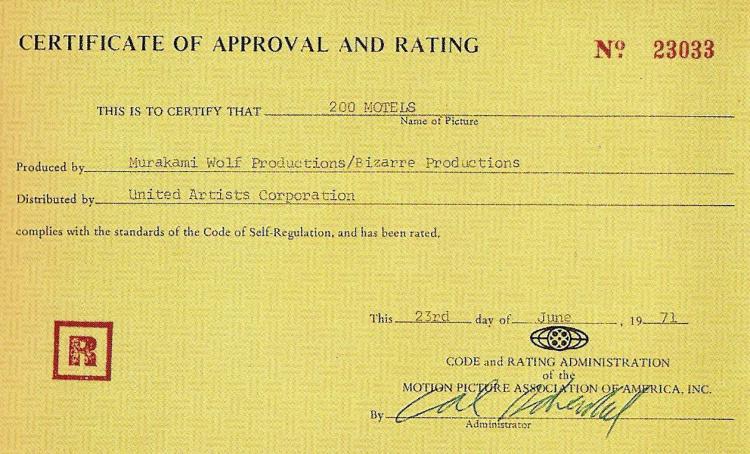 | Sometime in 1970, Herb and Frank approached an executive named David Picker at United Artists Pictures (now a subsidiary of Metro-Goldwyn-Mayer Inc.) with a ten page synopsis of what “200 Motels” would be, a couple boxes of tape and some press clippings. By the conclusion of the meeting a deal had been struck. Bizarre Productions had sold United Artists the motion picture and soundtrack album. One of the things which was agreed was that Bizarre couldn’t deliver a film that would be rated X, at that time the MPAA rating that allowed no one under 17, no matter who they were with, admittance into the theatre. Eventually, a budget of approximately $600,000 was agreed upon for both film and album. Frank would later say the total spent ended up being $679,000. |